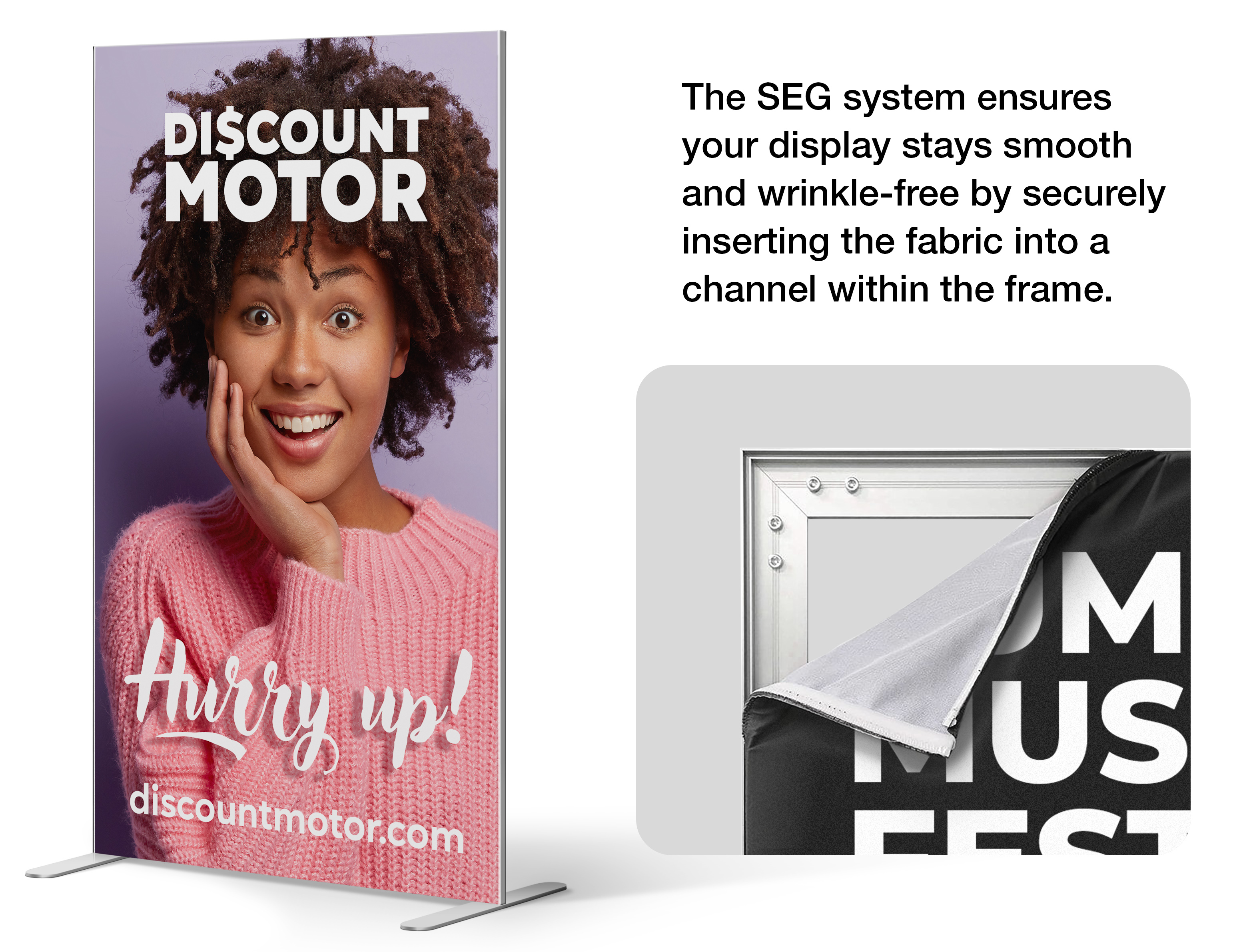 Versatile SEG frame displays are the perfect solution for eye-catching indoor presentations. Designed for effortless setup, takedown, and transport, they move seamlessly from one event to the next with a convenient, secure carrying bag.