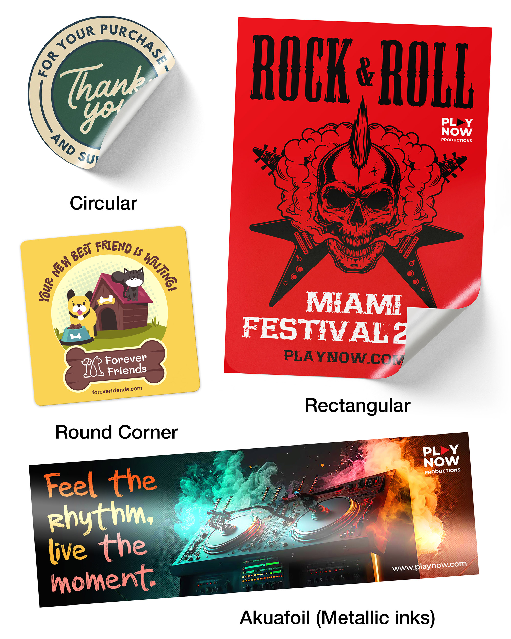 Our 70lb paper stickers feature a permanent adhesive and convenient slit backing, making them easy to peel and apply smoothly to a variety of clean, flat surfaces. Printed in vibrant full color they are ideal for retail packaging, product labels, box and envelope seals, and political or guerrilla marketing campaigns.